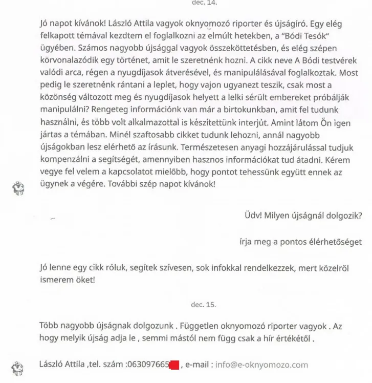 A harmadik ember azzal hívta fel szerkesztőségünket, hogy őt egy magát független oknyomozó riporternek és újságírónak kiadó férfi kereste fel, viszont a levele hemzseg a helyesírási hibáktól, teljesen egyértelmű képtelenségektől, így vélelmezi, hogy egy csaló írogat neki. Őt arra kértük, hogy adja át újságírónknak a „független újságíró” telefonszámát, hogy beszélhessünk vele. „László Attila vagyok, oknyomozó riporter és újságíró. Egy elég felkapott témával kezdtem el foglalkozni, a 'Bódi tesók' ügyében” – szólt a levél.