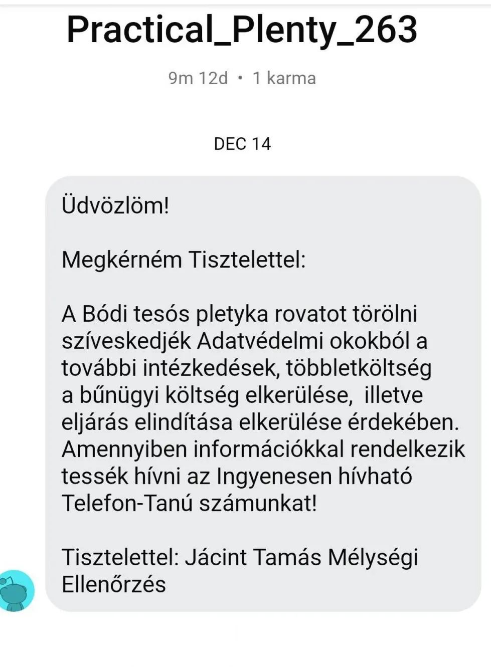 Valaki nagyon meg akarja védeni a „Bódi tesókat” a pletykáktól, ha képes ezért rendőrnek kiadni magát. Megkérdeztük azért az ORFK-t, mit gondolnak a kamu rendőrségi levélről. „Amennyiben a csatolmányban szereplő üzenet címzettje úgy érzi, hogy „megfenyegették” vagy más bűncselekményt kíséreltek meg elkövetni a sérelmére, javasoljuk, hogy tegyen bejelentést/feljelentést! Ezt megteheti elektronikusan, írásban, illetve személyesen bármely rendőr-kapitányságon. Sürgős esetben pedig a „Telefontanú” +36-80/555-111 zöld számán, vagy a 112-es segélyhívó számon kérhet segítséget. A rendőrség minden esetben megvizsgálja a bejelentés/feljelentés tartalmát és a szükséges intézkedéseket meghozza” – írja a valódi rendőrség.