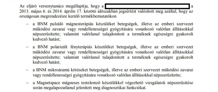 „A cég valótlanul állította, hogy a BNM pulzáló mágnesterápiás és a BNM polarizáltfény-terápiás készülékek alkalmasak betegségek, illetve az emberi szervezet működési zavarai vagy rendellenességei gyógyítására, és termékeit így is hirdette ("alkalmas színekkel való gyógyításra"), valamint valótlanul tulajdonított a termékeknek az egészségre gyakorolt kedvező hatást ("felgyorsítja az anyagcserét")”- közölte a GVH. „A BNM pulzáló mágnesterápiás készülék a gyártó megfelelőségi nyilatkozata szerint orvostechnikai eszköz, azonban az Egészségügyi Engedélyezési és Közigazgatási Hivatal (EEKH) felfüggesztette a készülék forgalmazását orvostechnikai eszközként, és megtiltotta reklámozását is” – írják.