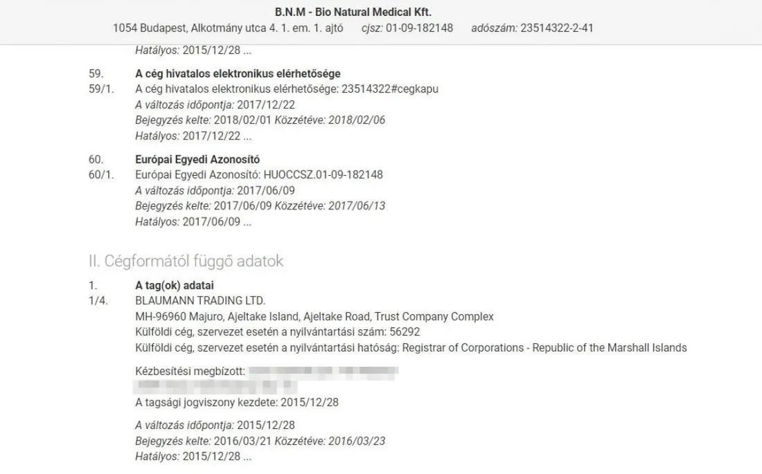 A BNM termékeket forgalmazó cég a BNM - Bio Natural Medical Kft., aminek a tulajdonosa egy, a Marshall-szigeteken bejegyzett cég.