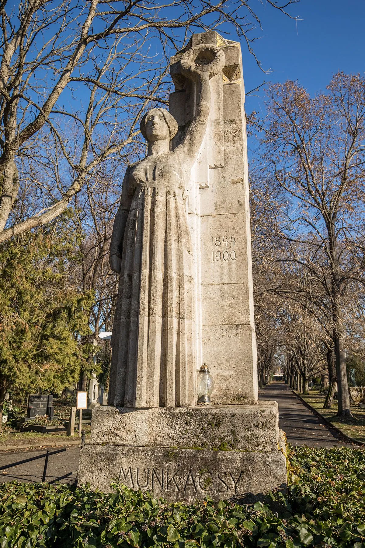 Munkácsy Mihály (1844-1900) messze a legismertebb magyar festőművész. Festészete a francia fővárosban teljesedett ki, ahol a Párizsi Szalon nagy aranyérmét is elnyerte. Egy Bonn melletti szanatóriumban halt meg, ahonnan vonattal szállították haza, majd a Műcsarnokban ravatalozták fel. Nagyszabású temetésén és síremléke tizenegy évvel későbbi avatásán tízezrek vettek részt. Lerótták kegyeletüket többek között a Habsburg királyi ház tagjai, az Andrássy család, Budapest főpolgármestere és Munkács polgármestere. Természetesen megjelent az özvegye is, aki - mai kifejezéssel élve - részben a festőművész menedzsere is volt.