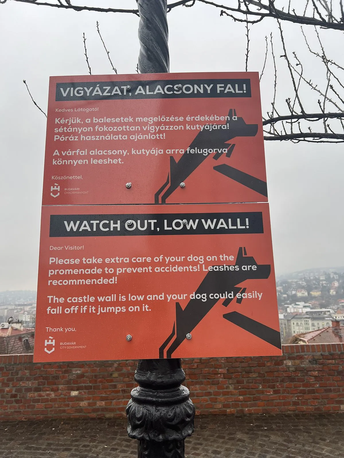 Tíz éve rendszeresek a kutya-balesetek a budai Várban, az alacsony várfal miatt. Az itt kijelölt kutyafuttató hatalmas veszélyt rejt magában a négylábú kedvenceinkre.Elég egy madár megkergetése, vagy egy félre dobott labda, és már meg is történt a baj. Erről többször cikkezett a Ripost is. Most a kutyás balesetek, és számtalan bejelentés után lépett az önkormányzat és kihelyezett 42 magyar és angol nyelvű figyelmeztető táblát. A tragédiák elkerüléséért azonban a gazdák tehetnek a legtöbbet, hogyha odafigyelnek négylábú barátaikra.