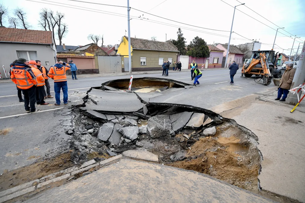 Csőtörés miatt beszakadt az útburkolat a debreceni Rakovszky Dániel utcában január 12-én.