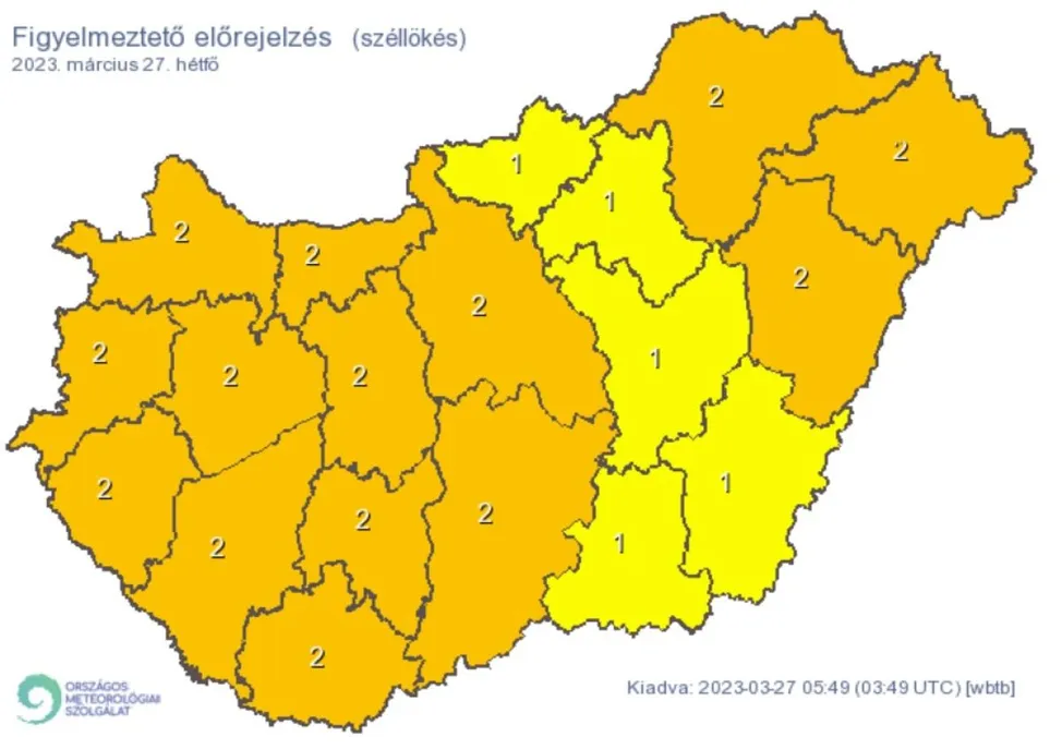Az OMSZ a kora reggeli órákban nemcsak elsőfokú, hanem másodfokú riasztást is adott ki a viharos szél és az eső miatt. Mint írják, hétfőn napközben egyre nagyobb területen feltámad az északnyugati szél, a déli óráktól a Dunántúlon, a főváros térségében és a Duna-Tisza közén (Pest és Bács-Kiskun térsége), majd estétől már északkeleten is (Zempléni-hegység, Bodrogköz, Nyírség, Hajdúság) viharos, általában 70-90 km/h, de időnként akár 90 km/h-t meghaladó, egy-egy helyen a 100 km/h-t is elérő erősen viharos széllökésekre kell számítani.