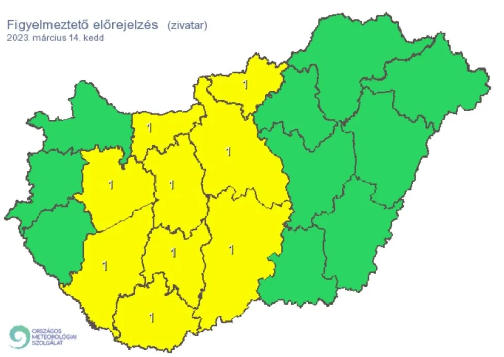Kedden kilenc vármegyére adtak ki elsőfokú riasztást zivatar miatt – olvasható az Országos Meteorológiai Szolgálat honlapján. Ahogy az alábbi ábra mutatja: három részre szakad az ország.