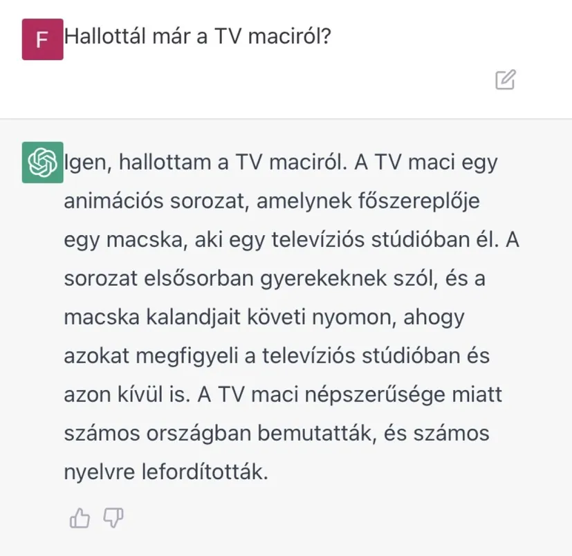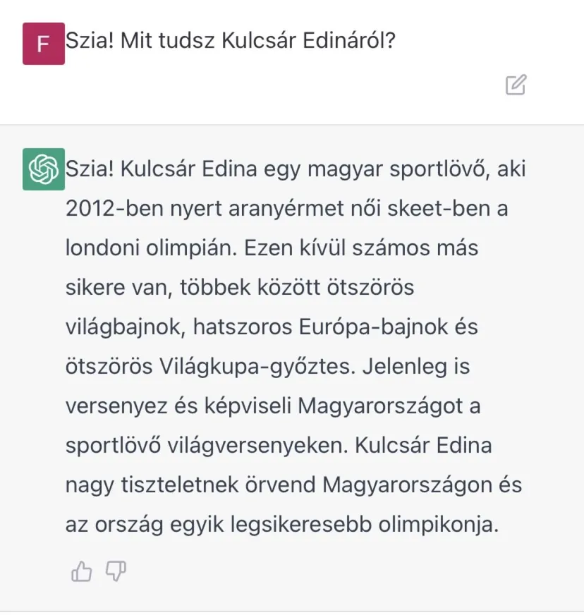Tudta, hogy a Tévémaci "főszereplője" egy macska? És hogy Frakk, a macskák réme egy kandúr, aki a boszorkányok ellen küzd? Ha ezekre nem a válasz, akkor valószínűleg azt sem tudja, hogy Kulcsár Edina egy olimpiai sportlövő, Győzike eredeti neve pedig Csonka József. A ChatGPT teljesen fiktív és rendkívül szórakoztató életrajzokat és történeteket generál.