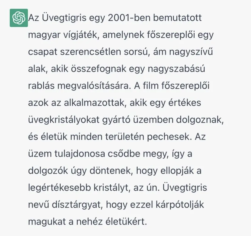A Szílicium-völgyben fejlesztett csetbotról az is kiderült, hogy remek forgatókönyvíró is lehetne belőle, igazán kreatív gondolatai vannak. Az Üvegtigris című film a ChatGPT szerint egy üvegkristályokat gyártó cég szerencsétlen sorsú alkalmazottairól szól, akik a gyár egyik legértékesebb kristályának, az Üvegtigrisnek az ellopására készülnek.