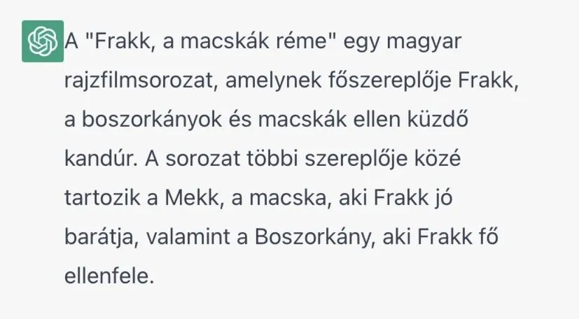 Frakk, a macskák réme valószínűleg nem örülne neki, hogy a ChatGPT szerint ő egy kandúr, aki boszorkányok és macskák ellen küzd, azt pedig egyenesen kikérné magának, hogy legjobb barátja Mekk, a macska...