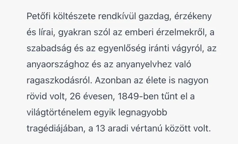 Jól indul a ChatGPT életrajza Petőfi Sándorról, a végén azonban megtudhatjuk, hogy a költő „élete nagyon rövid volt, 26 évesen, 1849-ben tűnt el a világtörténelem egyik legnagyobb tragédiájában, a 13 vértanú között volt”
