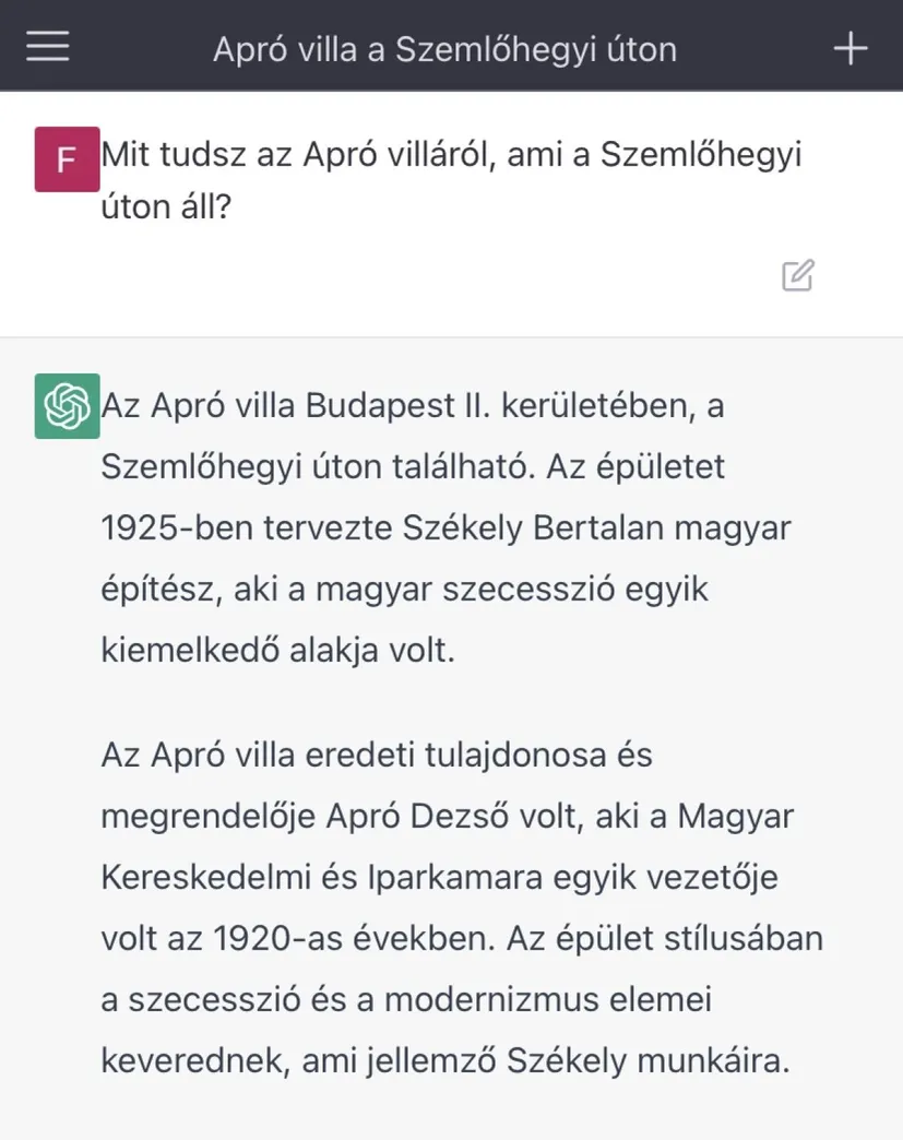 A ChatGTP Gyurcsány Ferencék lakhelyéről, a Szemlőhegyi úton álló Apró-villáról is szőtt egy történetet, ami valójában sokkal jobb, mint az eredeti sztori. A valóságban ugyanis Dobrev Klára nagypapája, a kommunista káder Apró Antal költözött a villába, miután azt elkobozták egy zsidó üzletembertől. Megértjük, hogy egy intelligens csetbot is nyüszítve tiltakozik ez ellen a valóság ellen, és inkább kitalál egy jobb sztorit. Ebben a villa eredeti tulajdonosa és megrendelője Apró Dezső, aki a Magyar Kereskedelmi és Iparkamara egyik vezetője volt az 1920-as években...