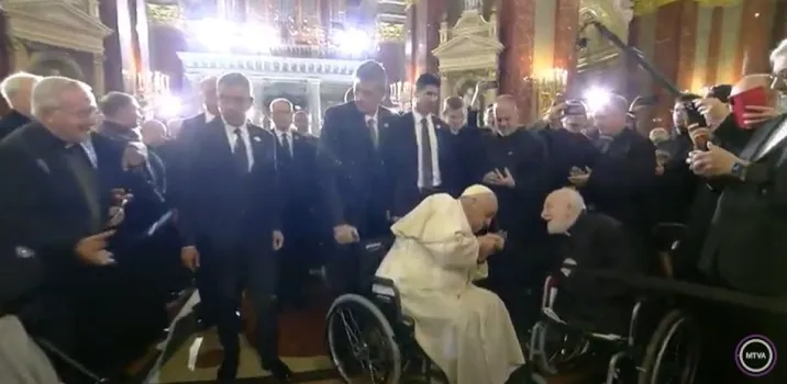 Péntek este közel kétezer egyházi személy előtt mondott beszédet a Szent István Bazilikában Ferenc pápa. Ott találkozott egy kerekesszékes pappal, Mihály atyával, akinek kezet is csókolt.
