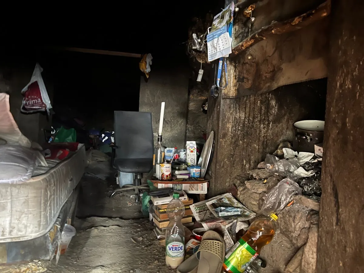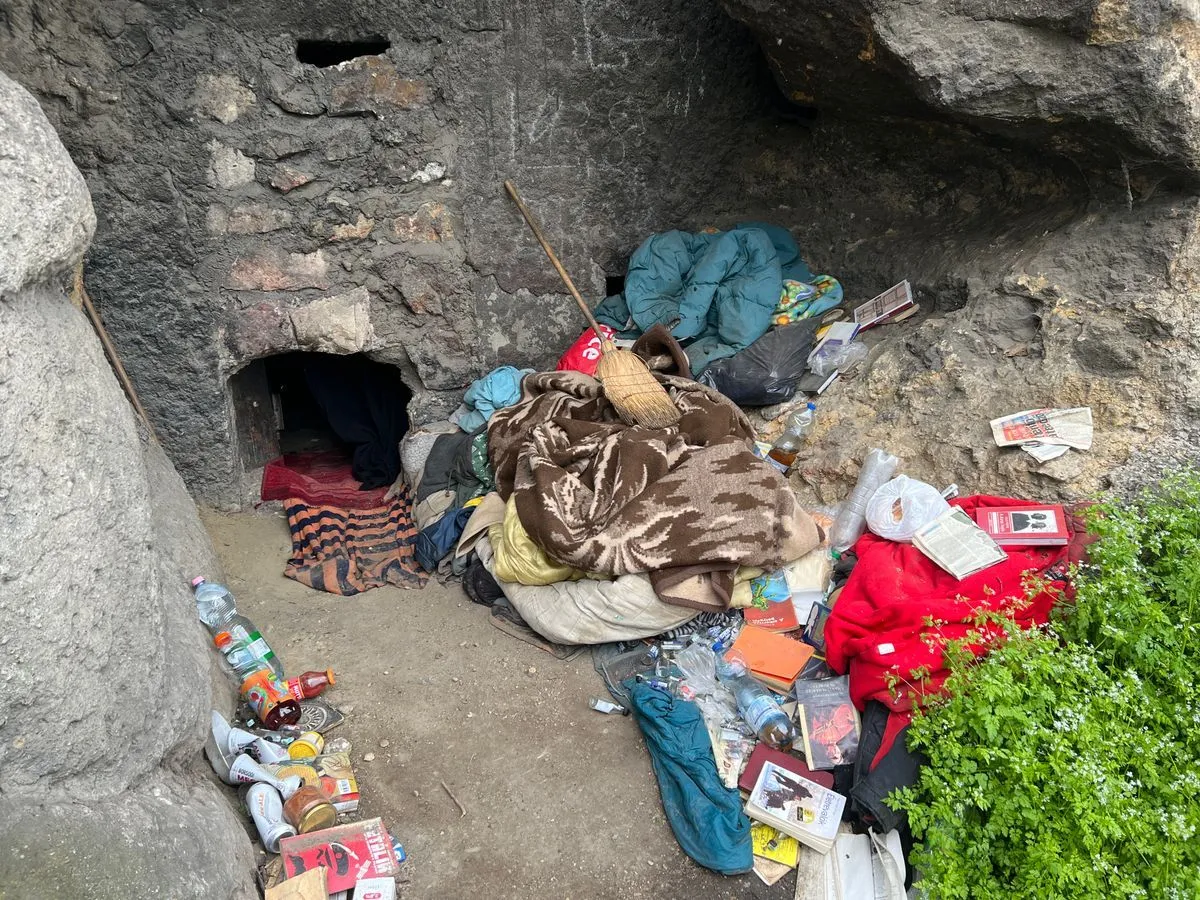 A fenti barlang a sátornál jóval komolyabb helynek tűnik: vastag matracok, gurulós irodai szék, könyvek is az ott élő vagy élők kényelmét szolgálják. A barlangban tűzhely is van, a kijáratnál pedig gondosan összevágott tűzifa sorakozik.