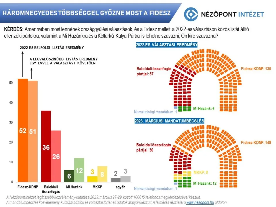 Módszertan – A Nézőpont Intézet legfrissebb közvélemény-kutatása március 27-29. között 1000 fő telefonos megkérdezésével készült. A minta minden kutatás esetében reprezentatív a 18 évesnél idősebb lakosságra nem, kor, régió, településtípus és iskolai végzettség szerint. 1000 fős mintanagyság és 95 százalékos megbízhatósági szint esetén a mintavételi hiba ± 3,16 százalék. Bázis = magyar választók, a választási részvételüket biztosra ígérő válaszadók. A pártok hazai listás eredményének lehető legpontosabb megállapításához a Nézőpont Intézet logisztikus regressziót alkalmaz.