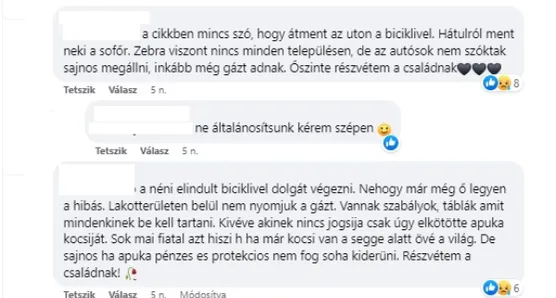 „Lakott területen belül nem nyomjuk a gázt. Vannak szabályok, táblák, amit mindenkinek be kell tartani. Kivéve, akinek nincs jogsija, csak úgy elkötötte apuka kocsiját. Sok mai fiatal azt hiszi, hogy ha kocsi van a segge alatt övé a világ” – írta egy másik nő.