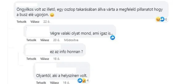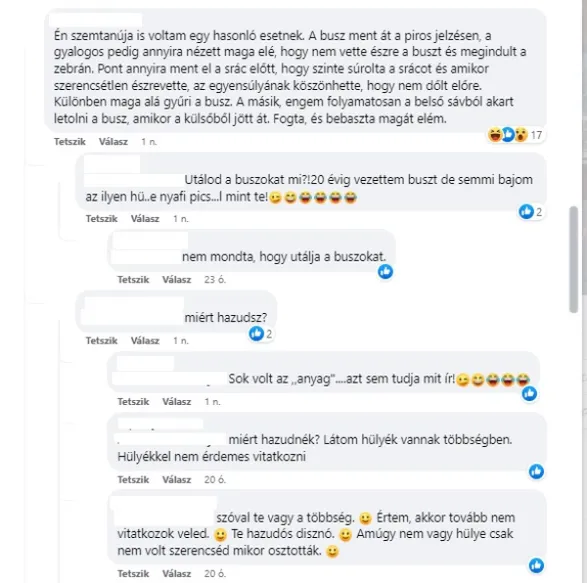 Leírta a véleményét egy hölgy is, akinek buszokkal, buszsofőrökkel volt rossz tapasztalata. „Én szemtanúja is voltam egy hasonló esetnek. A busz ment át a piros jelzésen, a gyalogos pedig annyira nézett maga elé, hogy nem vette észre a buszt és megindult a zebrán. Pont annyira ment el a srác előtt, hogy szinte súrolta a srácot és amikor szerencsétlen észrevette, az egyensúlyának köszönhette, hogy nem dőlt előre. Különben maga alá gyűri a busz. A másik, engem folyamatosan a belső sávból akart letolni a busz, amikor a külsőből jött át. Fogta, és be**szta magát elém” – írta. Ami az ő kommentje után történt az érthetetlen, többen lehazugozták, és mindenfélének elhordták.