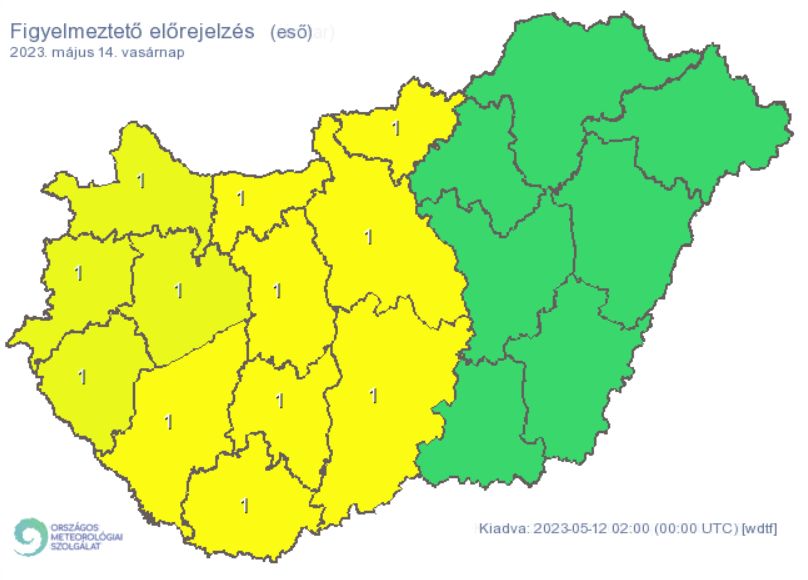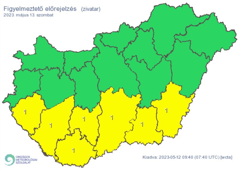 Szombaton az összefüggő felhőzet lassanként szakadozik, gomolyosodik, amelyből újabb záporok, délen zivatarok is kialakulhatnak. A zivatarokat átmeneti szélerősödés és intenzív csapadék kísérheti. A keleti, délkeleti szél helyenként élénk lesz. A legmagasabb nappali hőmérséklet 13 és 20 fok között valószínű. Az Országos Meteorológiai Szolgálat erre a napra, illetve vasárnapra is figyelmeztető előrejelzést adott ki a fél országra a záporok, esőzések miatt.