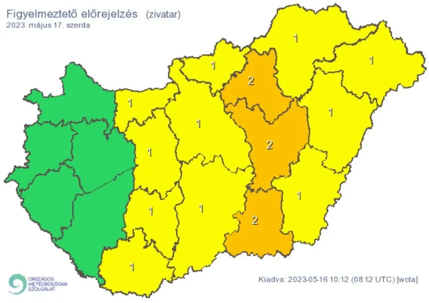 Szerdára a legtöbb vármegyében zivatar miatt adtak ki elsőfokú riasztást, Győr-Moson-Sopron, Vas és Veszprém vármegyében ugyanakkor széllökés miatt él a citromsárga riasztás. Ezeken a területeken a várt legerősebb széllökések meghaladhatják a 70 km/h-t!
