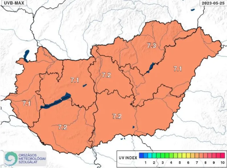 Az Országos Meteorológiai Szolgálat térképe szerint május 25-én a 10-es UV-skálán 7,2-7,3-as értékeket mérhetünk, ami rendkívül magas.
