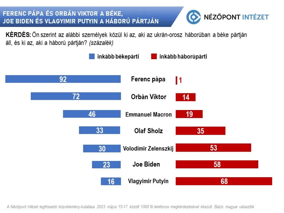 A Nézőpont Intézet közvélemény-kutatása szerint a legismertebb vezetők közül Ferenc pápát és Orbán Viktort tartják a legnagyobb arányban békepártinak a magyarok.