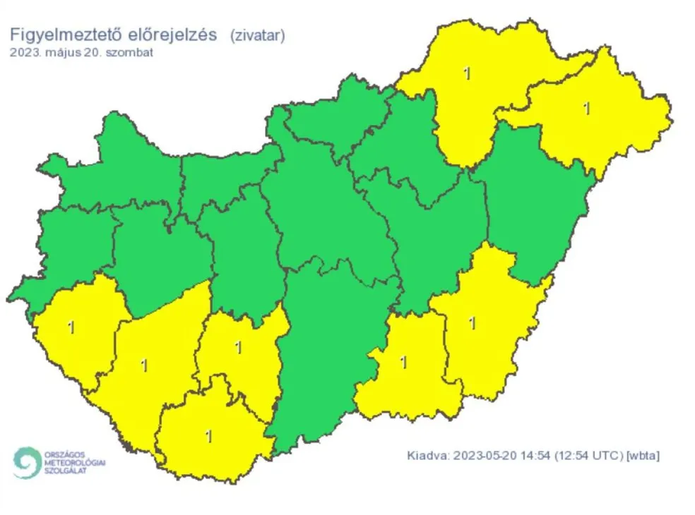 Elsőfokú, citromsárga riasztást adott ki zivatarok kialakulása miatt az Országos Meteorológiai Szolgálat. Az érintett területeken elsődleges veszélyforrást a villámlás jelent, emellett esetenként megerősödhet a szél, és jégeső is előfordulhat.