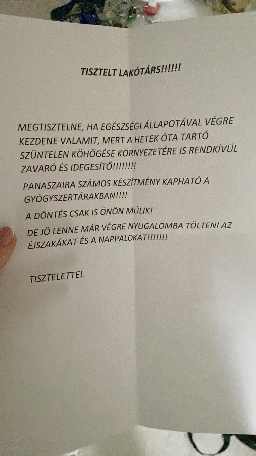 Atomjaira szedik a szomszédot, aki levelet írt, mert zavarta a köhögés