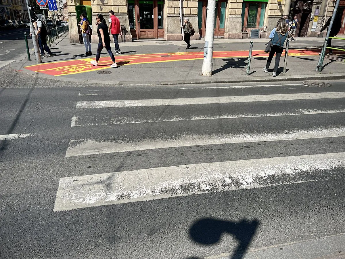 Szomorú a látvány. Talán majd ha egyszer a gyalogosokra is gondol a Városháza, és nem csak a bicikliseknek "áll a zászló", talán újra festik Karácsony Gergelyék. Mert ez így szintén balesetveszélyes...