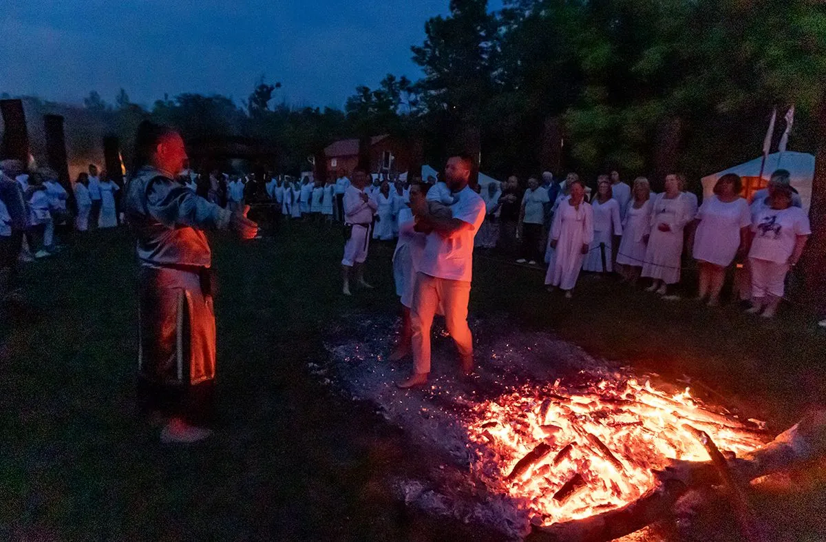 A nagy máglyát az őrtűzzel gyújtotta meg négy fiatal, majd az ünnep fénypontja az esti parázson járás volt, ami a félelmeinken való túllépés egyik szimbóluma. A jelenlévők egymás kezét fogva körülállták a megszentelt területet és együtt énekelve átszellemültek, majd akiket "hívott a tűz", sikeresen átsétáltak a parázson mezítláb. Mindenki felajánlotta a parázson járását a számára fontos dologért, például a hazáért, a családért.