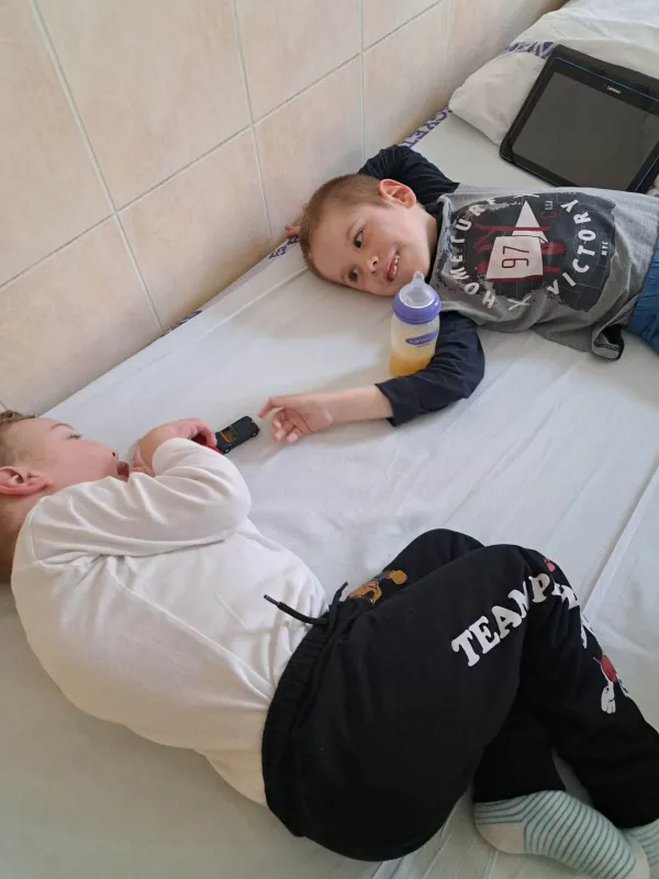 Tomika nagyon ügyes volt a mozgásvizsgálaton is, szépen csinálta a feladatokat. A lumpbálás is elsőre sikerült, hála az ügyes doktor úrnak. Tomika megint észre sem vette, mikor szúrták meg. Most a kötelező pihenési időt is nagyon jól viselte. Amikor éppen nem kellett vizsgálatokon részt vennie, akkor önfeledten játszottak kis barátjával, Mátéval. Nagyon édesek voltak együtt, megható volt látni mekkorát nőttek az utolsó alkalom óta.
