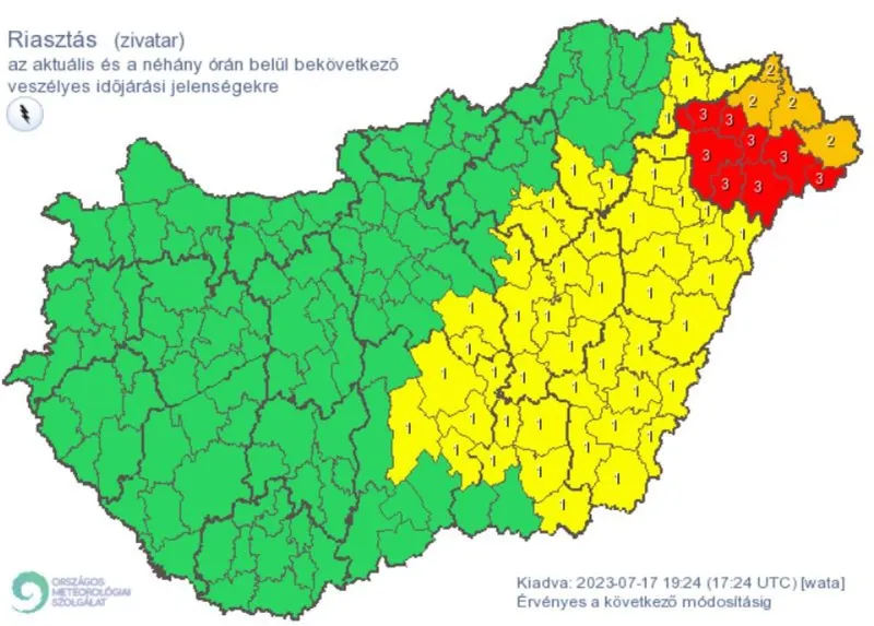 A tájékoztatás szerint Heves, Borsod-Abaúj-Zemplén, Szabolcs-Szatmár-Bereg és Hajdú-Bihar vármegyék egyes járásaiban kell a legnagyobb zivatarokra és felhőszakadásra felkészülni, amelyeket óránként 90-100 kilométeres sebességet meghaladó károkozó szél és két-három centiméteresnél nagyobb jeget produkáló jégeső is kísérhet.