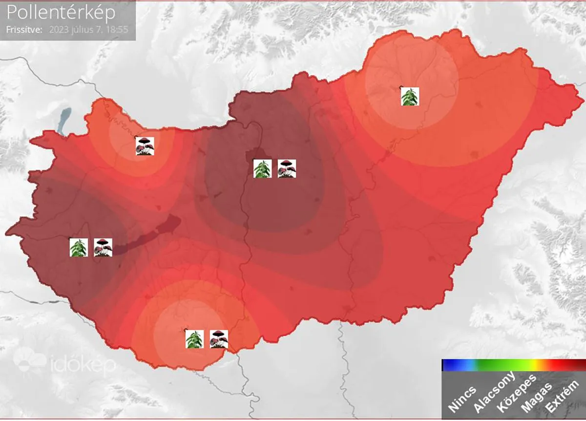 A következő napokban a pollenterhelés erősödésére számíthatunk. Jelenleg főleg nyugat-, és közép Magyarország területén a legmagasabb a pollenkoncentráció, de a csalánfélék és a pázsitfűfélék szinte mindenütt tarolnak, az allergén gombákról nem is beszélve. A legfertőzöttebb terület Budapest, Miskolc, Győr, Zalaegerszeg és Pécs. Budapesten a gombaspórák nagyon magas számban vannak jelen.