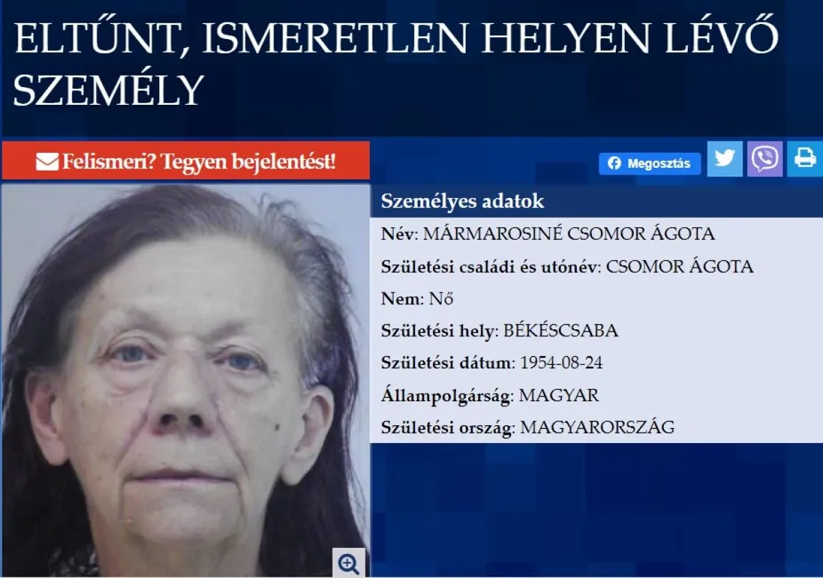Mármarosi Csomor Ágota vasárnap, 11:00 óra körül tűnt el a horvátországi Rovinjban– írja a police.hu. Legutóbb a városban lévő, Restaurant & Rooms BOŠKET étterem előtt látták. A 68 éves hölgynél tavaly nyáron demenciát diagnosztizáltak, így kicsit fél az emberektől. A hölgyön pink felső, fehér színű Nike rövidnadrág és fekete-lila Devergo papucs volt. Most a horvát és a magyar rendőrség is őt keresi, fia pedig motorral szeli Rovinj utcáit és kutatja édesanyját szüntelen.
