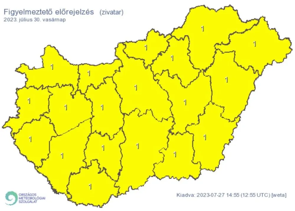 Vasárnapra viszont megint elromlik az idő: vastagabb, frontális felhőzet vonulhat át az ország felett északnyugatról délkelet, kelet felé. A hétvége utolsó napján már nem lesz olyan hely, ahol ne fordulhatna elő eső, záporeső, zivatar, emiatt az ország egészét sárgára színezték az előjelzési térképen. A csapadékrendszer a nap folyamán nyugatról kelet felé helyeződik át. Helyenként megélénkül a déli, majd északnyugati szél, zivatarban erős lökések is lehetnek. A minimum-hőmérséklet 14 és 21, a maximum 22 és 33 fok között valószínű, keleten lesz a melegebb, a tartósabban csapadékos tájakon a hűvösebb idő.