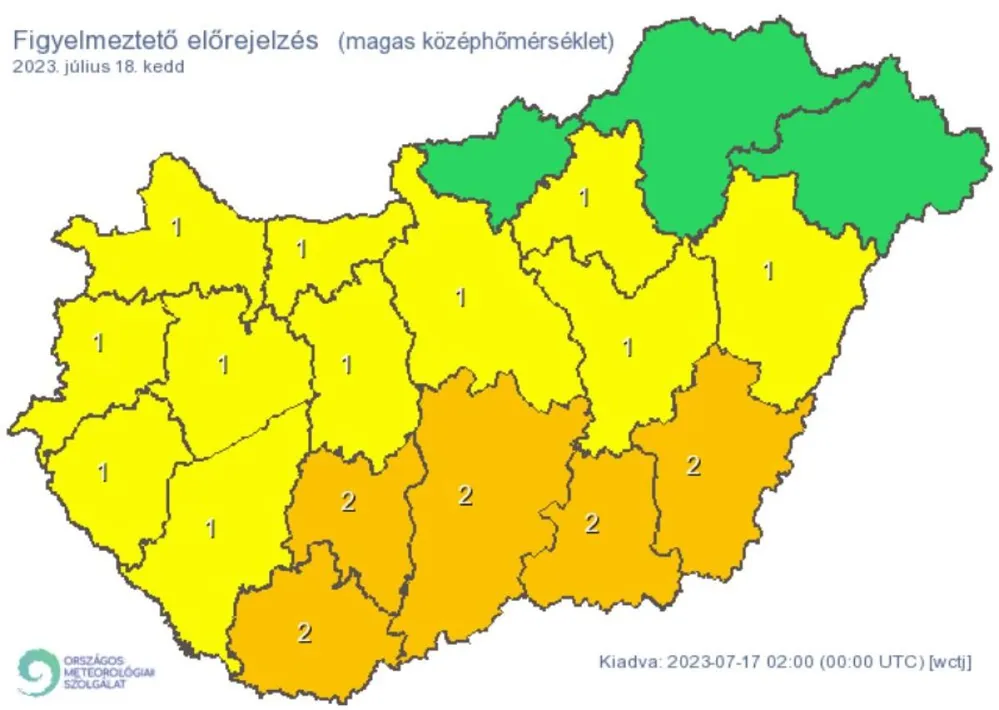 Az előrejelzés szerint kedd délelőtt a Dunántúlon még felhősebb lehet az ég, majd ott is napos idő várható kevés fátyol- és gomolyfelhővel. Csapadékra az ország nagy részén nem kell számítani, legfeljebb elvétve fordulhat elő egy-egy zápor. Az északnyugati szél többfelé megélénkül, késő délutántól a Dunántúlon délies irányba fordul. A legmagasabb nappali hőmérséklet 30 és 35 fok között valószínű. A legalacsonyabb éjszakai hőmérséklet döntően 18 és 23 fok között alakul, ennél pár fokkal hűvösebb csak az Északi-középhegység völgyeiben lehet, vagyis a legtöbb helyen az éjszakai lehűlés sem igen fog enyhíteni a nappali forróságon.