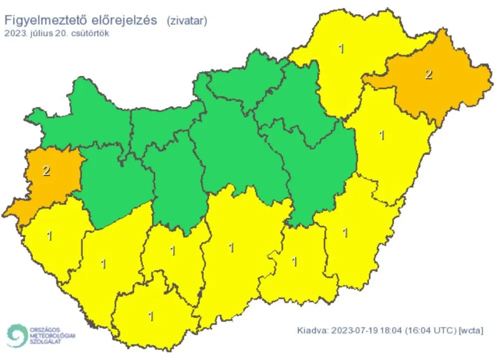 Kárpátaljáról egy szupercella elérheti Magyarország északkeleti járásait, ezért ismét kiadták a narancs riasztást. Ugyanez érvényes az ország másik végében is, ahova nyugatról sodródhat át egy-egy zivatar. További 9 vármegyére elsőfokú figyelmeztetést adtak ki.