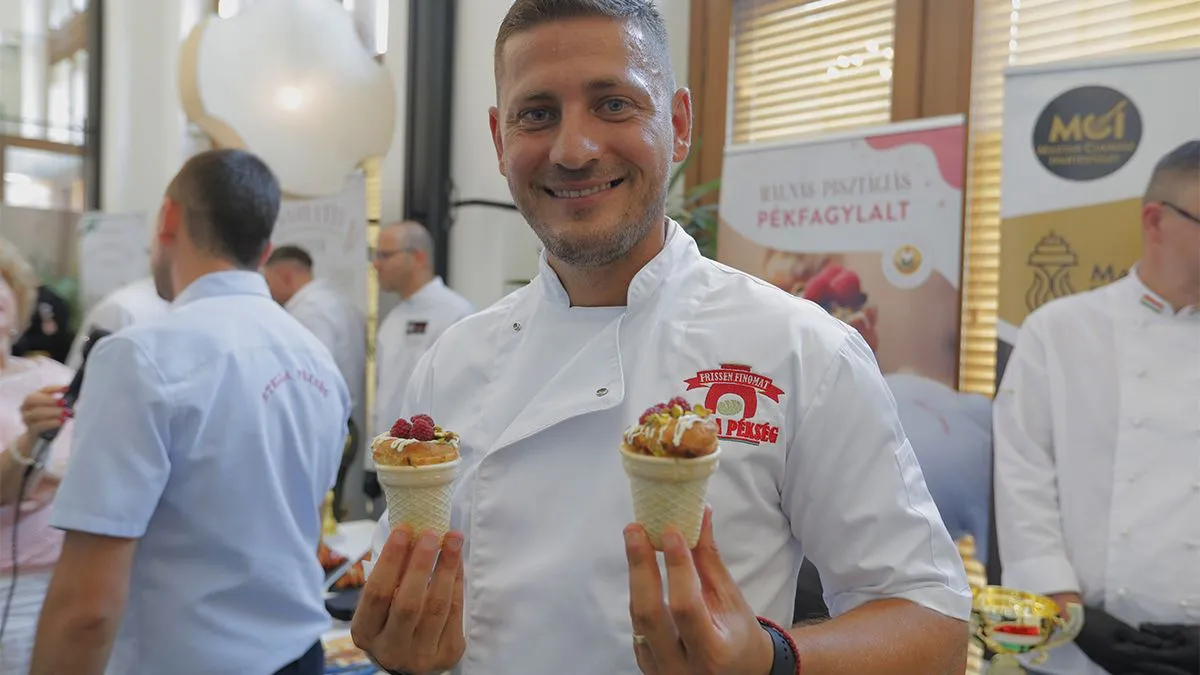 „A málna jó választásnak tűnt, ezt a gyümölcsöt egészítettük ki a roppanós pisztáciával, amihez még fehércsokoládét reszeltünk. Ez a három íz tökéletesen harmonizál egymással. Kinézetre fagylalt, de nem nyalni kell, hanem harapni. Amikor a három éves kisfiam azt mondta, hogy apa, ez nagyon finom, akkor tudtam, hogy elkészültünk" - mesélte a Szinobor Kft. ügyvezetője, Éles Szilárd.