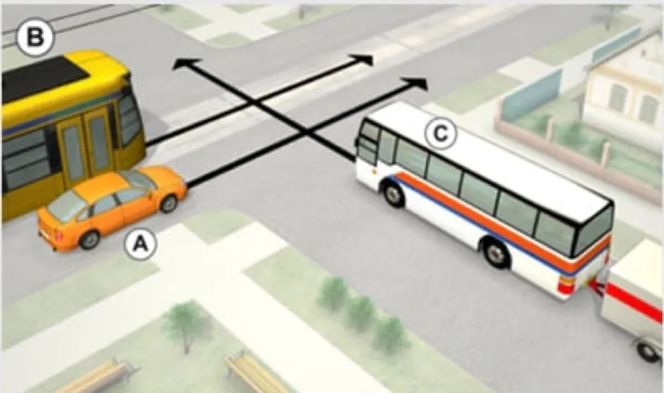A megoldás: B-C-A. A jobbról érkező villamos elsőbbséget élvez, az autó és a busz viszonylatában pedig a jobbkéz szabály érvényesül.