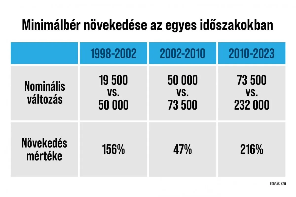 A Központi Statisztikai Hivatal, azaz a KSH számaiból az is kiderül, hogy a minimálbérek a rendszerváltás óta rendszerint csak a jobboldali kormányok alatt tudtak jelentősen növekedni. A baloldali kormányok alatt a minimálbérek emelkedése elenyésző volt.