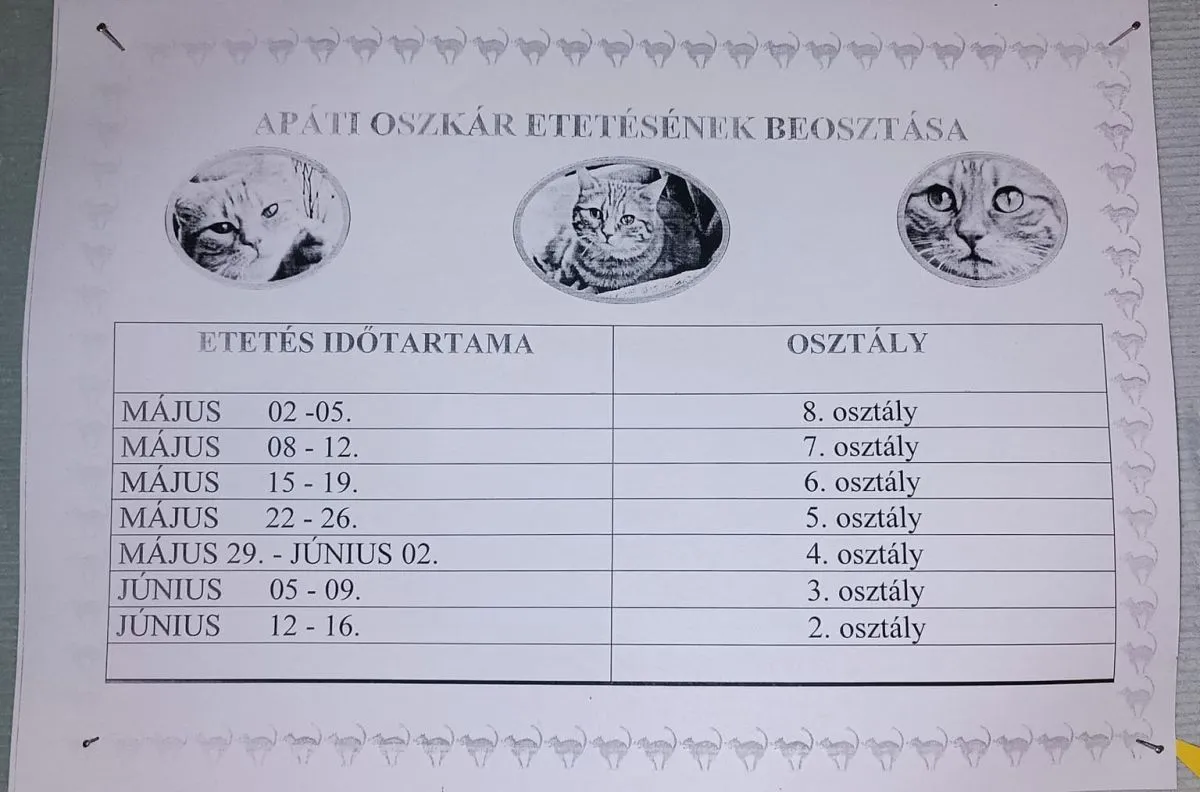 A gyermekem iskolája fogadta be Oszkárt, mert nagy valószínűséggel kidobták. A tanárok azonnal feladatot kovácsoltak a háziállatból: minden héten másik osztály felelős az etetéséért. A cica nevét is a diákok döntötték el, szavazással.