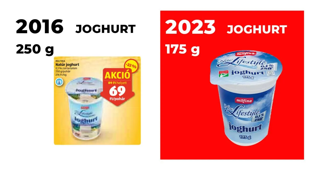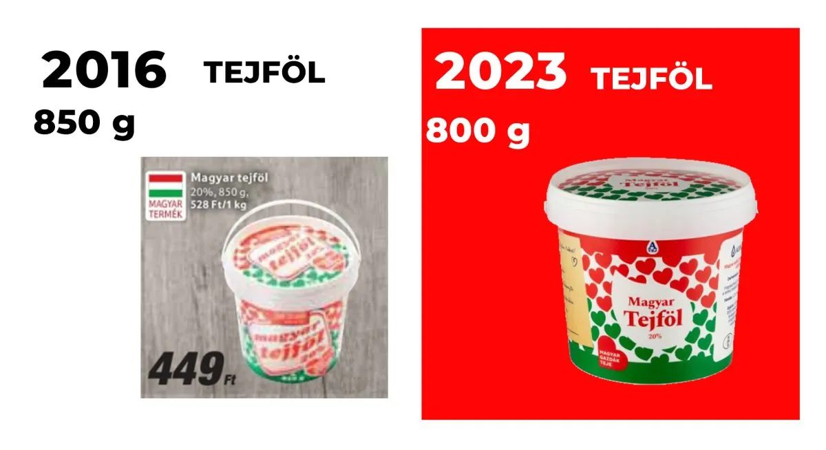 A kaukázusi kefir első ránézésre még nagyobb is lett, de valójában 20 grammal kevesebb van benne. Fotó: Ripost30 százalékot zsugorodott az Aldi sajátmárkás joghurtja. Fotó: RipostA vödrös tejföl sem olyan nagy kiszerelésű már, mint volt. Fotó: RipostMár 20 grammal kevesebb kukoricát raknak a konzervbe, mint korábban. Fotó: RipostMár a tepsis halfilével sem lehet úgy jóllakni, mint korábban Fotó: Ripost17 százalékkal kevesebb van már a Nestlé gabonapelyheibenAz 50 gramm különbség már számottevőnek mondható. Fotó: RipostAz amerikai szendvicskenyér a felére (!) zsugorodott, de ma már így is drágább, mint régen. Fotó: Ripost