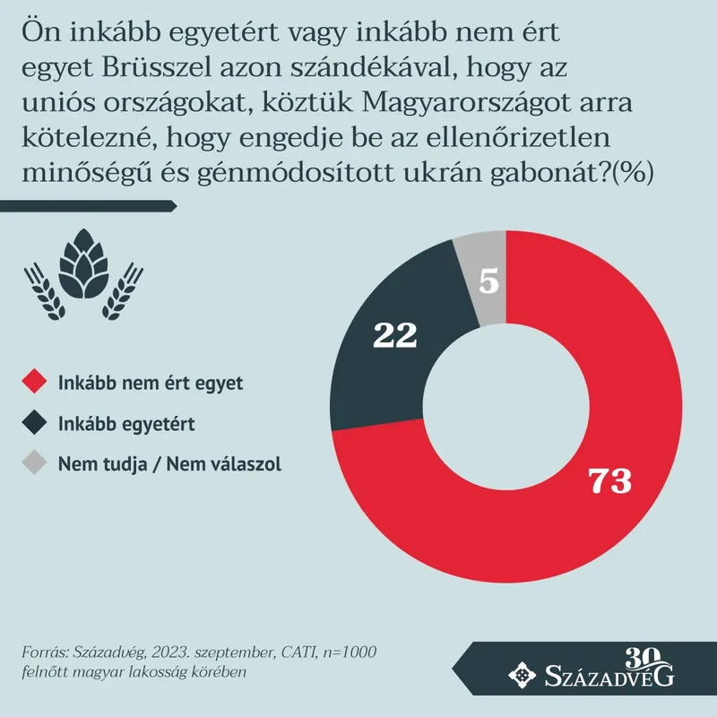 Ennek fényében nem meglepő, hogy a közvélemény-kutatási adatok szerint a magyarok jelentős többsége elutasítja az ukrán gabonadömpinget ösztönző brüsszeli nyomást. A felmérés rávilágít, hogy a válaszadók közel háromnegyede (73 százaléka) ellenzi Brüsszel szándékát, amely az uniós tagállamokat, köztük Magyarországot arra kötelezné, hogy engedje be az ellenőrizetlen minőségű, génmódosított ukrán gabonát.