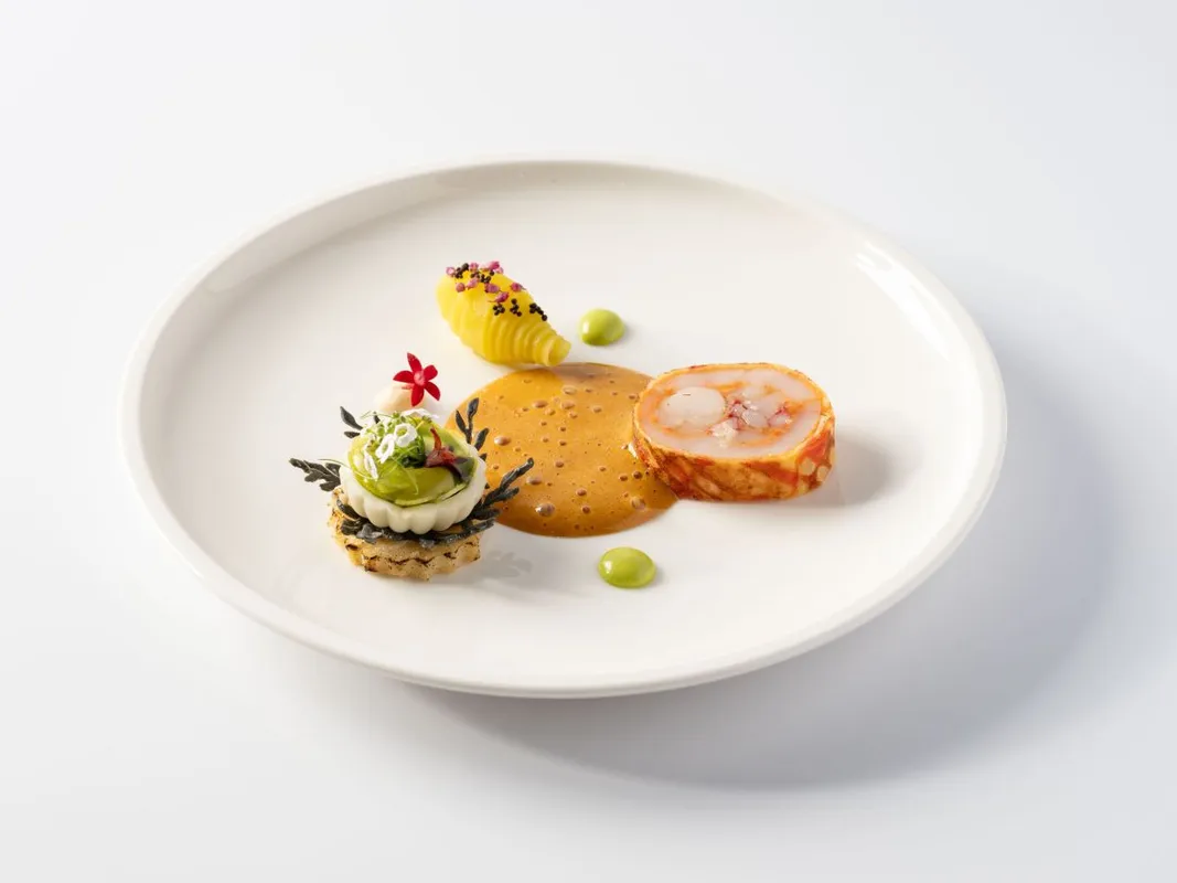 2. Fésűkagylóba göngyölt homár „Hortobágyi” barna vajjal glasszírozva, zellerkehely, marinált zöldalma, grillezett kapros osztriga, zsenge sárgacékla croissant, torma, citrus, kapros osztrigamajonéz.