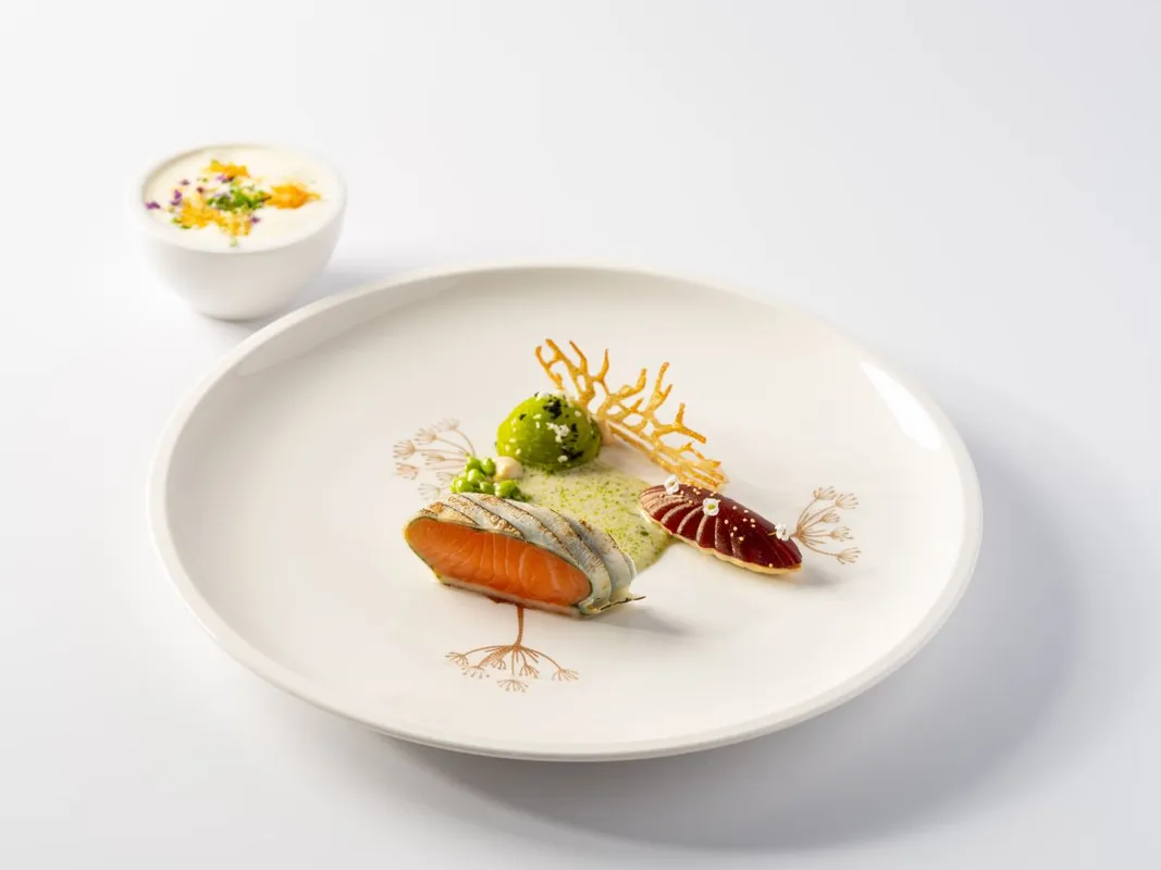 1. Sóstói” zöldalgás lazacgerinc zellerköntösben, tokaji borecettel marinált őszi cékla, fűszeres póréhagyma, marinált petrezselymes karalábé, brokkoli, csicsóka ropogós, kapros-tejszínes osztriga velouté, füstölt burgonyahab, krémes tojás, vargányás derelye, hegyi sült sajt.
