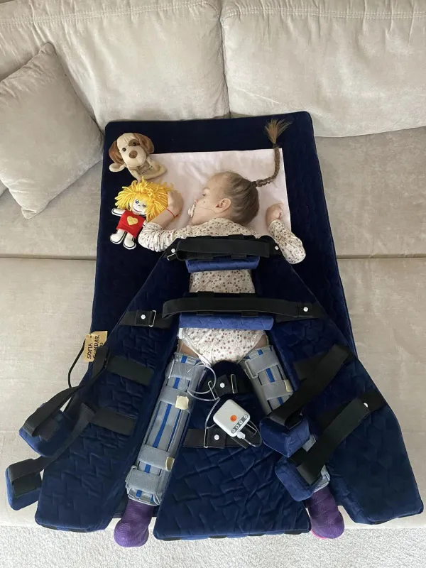 Szerencsére nem volt komplikáció a műtét alatt, minden jól sikerült. Szofi hamar magához tért az altatás után. A gyógytornász elmagyarázta, hogy kell megfogni, emelni, fordítani, átmozgatni Szofit, beállította a babakocsiját a megfelelő szögbe, hogy ameddig eszik, fél ülő pózban legyen.