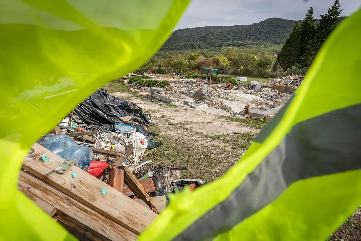 A lezárt területre ugyan nem lehet belépni, ez azonban a guberálókat egy cseppet sem zavarja. Valaki például épp a lap ottjártakor pakolta el a bútorok megmaradt törmelékeit tüzelőnek.