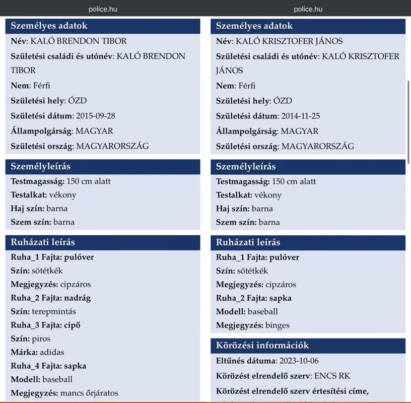 Nagy erőkkel keresik a tegnap délután eltűnt kiskorú testvérpárt. Kaló Brendon Tibor és testvére Kaló Krisztofer János egy éve került Halmajra nevelőszülőkhöz. Vér szerinti szüleik Putnokon élnek. Lapunknak a gyerekek nagynénje nyilatkozott, aki rettenetesen aggódik unokaöccseiért.