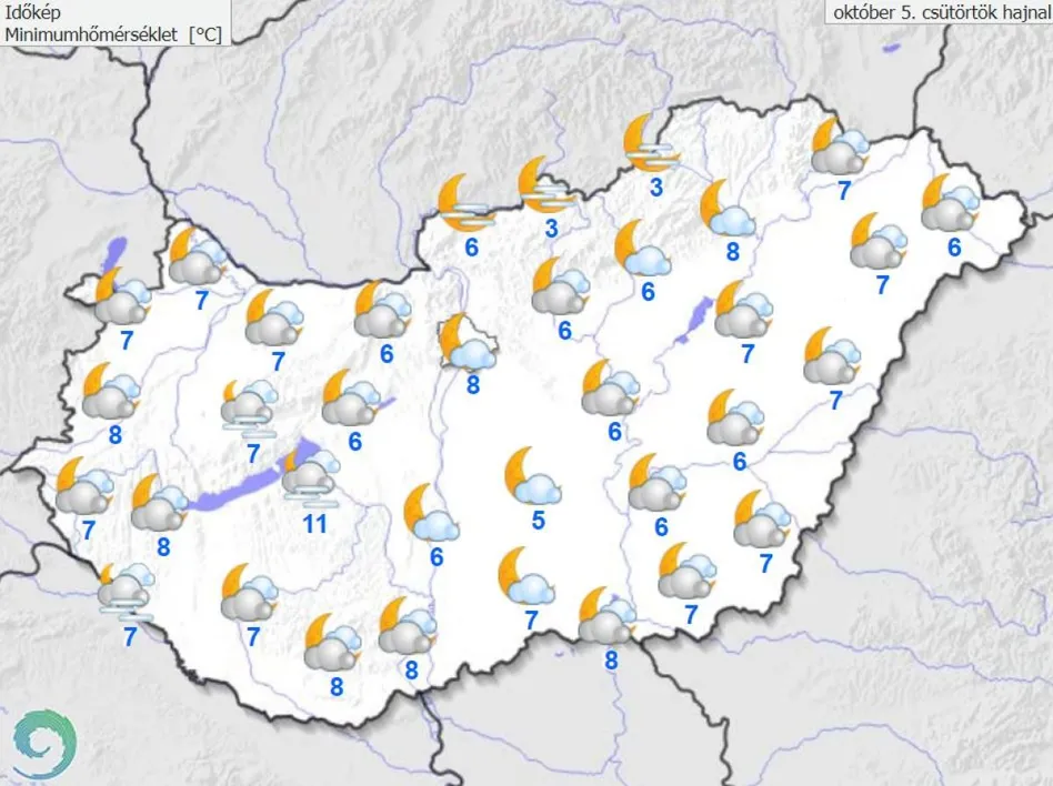 Csütörtökön átmenetileg mindenhol csökken a felhőzet, majd nyugat felől változó vastagságú fátyolfelhőzet sodródik fölénk. Párássá válik a levegő, foltokban köd is képződhet. Csapadék nem valószínű. A szél gyenge vagy mérsékelt marad. A minimum-hőmérséklet általában 6 és 10 fok között alakul, de a hidegre érzékeny helyeken ennél pár fokkal hidegebb lehet, a belvárosi, tóparti részeken pedig 10 fok feletti értéket is mérhetünk.