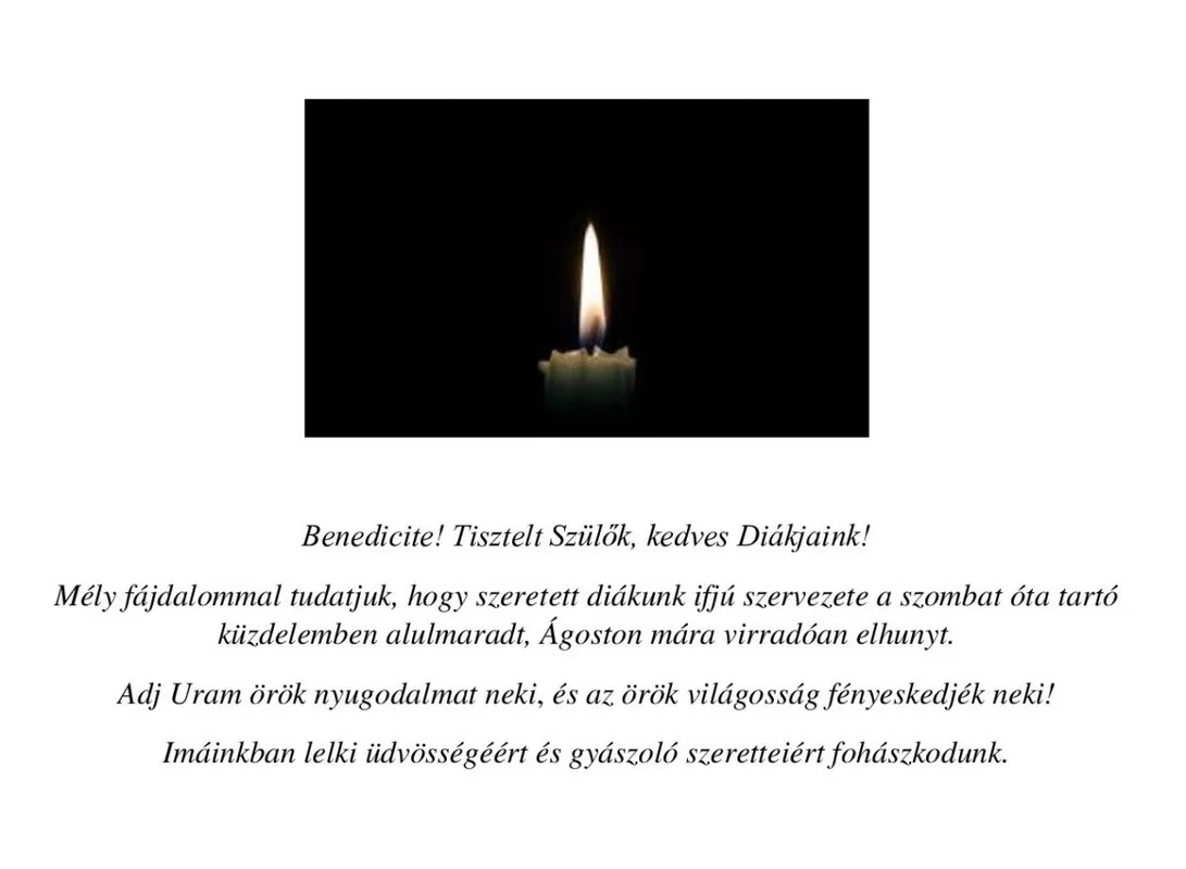 Miközben ő az intenzív osztályon feküdt, ismerősei és szerettei imaláncot indítottak érte. Vasárnap az iskola mellett lévő Szent Imre plébániatemplomban Ágoston gyógyulásáért még egy szentmisét is bemutattak, amin rengetegen részt vettek. Ám hiába a sok ima, a fiatal tegnap kora reggel közel egy hét után elhunyt a kórházban.