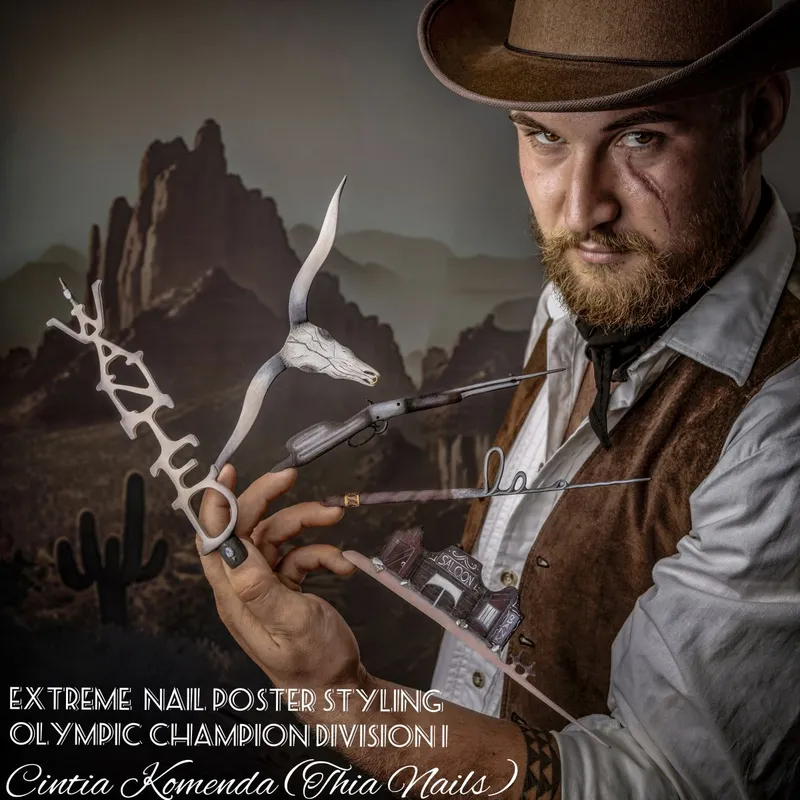 Nagyon fontos ebben a kategóriában, hogy elérd a "wow hatást". Én egy westernes bandita hangulaltú posztert valósítottam meg. A versenymunkám 160 órát vett igénybe, minden része kézzel faragott és festett, de megérte a fáradtságot. Igazi kihívás volt. Volt olyan köröm, amit háromszor kellett újraépíteni, de kitartottam