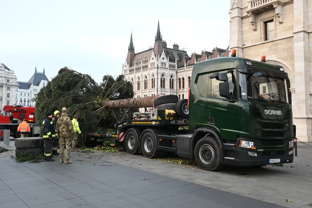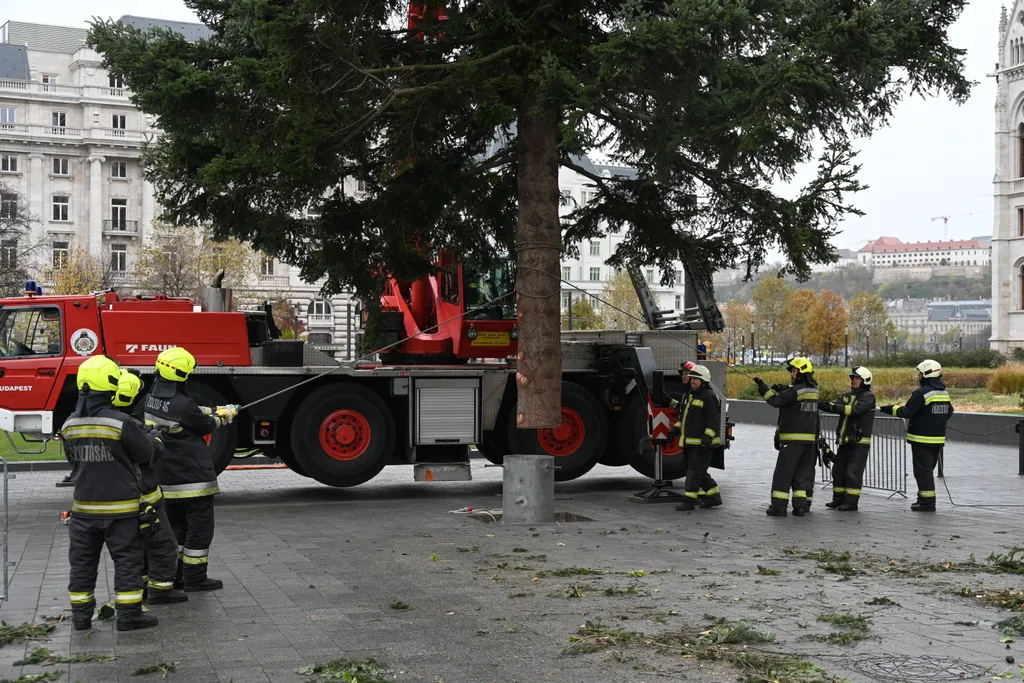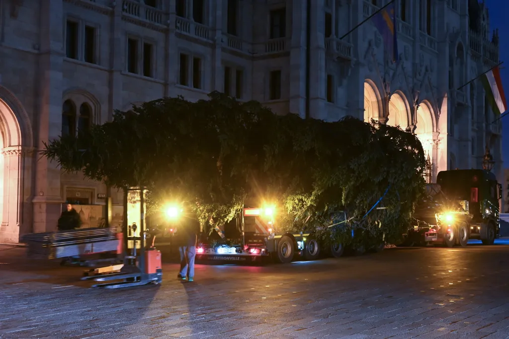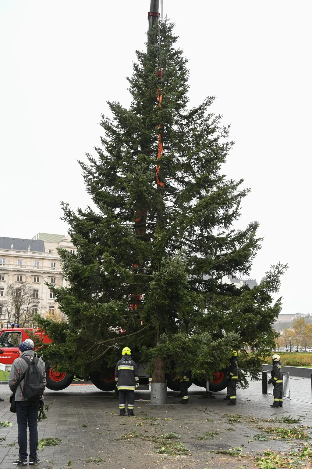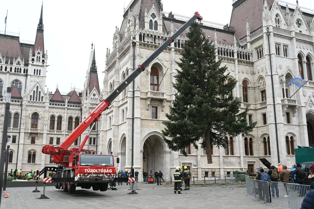 Felállították az ország karácsonyfáját az Országház előtt. A mintegy 24 méter magas, 80 centiméteres törzsátmérőjű, 5 tonnás fenyő egy hajdúszoboszlói családi ház kertjéből a katasztrófavédelem szakembereinek, a honvédség és a rendőrség munkatársainak közreműködésével érkezett meg a Kossuth Lajos térre.