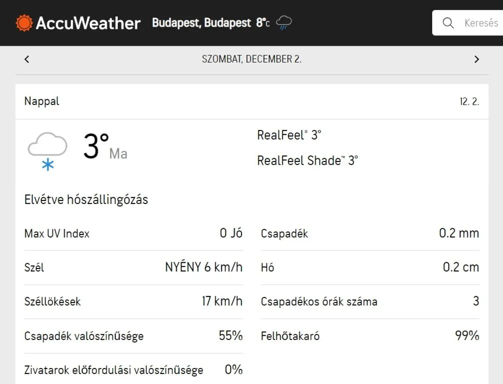 Az Accuweather meteorológiai portál előrejelzése szerint jövő szombaton, december 2-án három órán át hószállingózás várható Budapesten. A tél szerelmeseinek egy picit hevesebben doboghat majd a szíve, az autótulajdonosok pedig annak örülhetnek, hogy a várható 2 milliméteres hó miatt nem kell majd kiásni az autót a parkolóból.